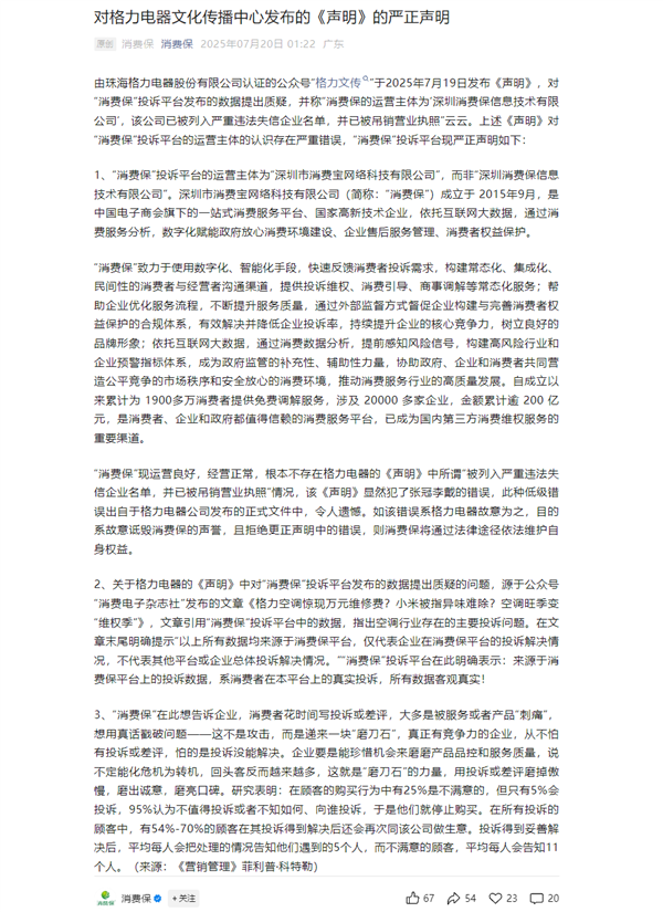 经核查,想用真话戳破问题——这不是攻击,该平台是民间机构,《格力空调惊现万元维修费?小米被指异味难除?空调旺季变“维权季”》文章于7月11日在公众号“消费电子杂志社”发布。统计方法不透明,消费保今天凌晨发表长文回应,不存在格力所提及的被列入严重违法失信企业名单或已被吊销营业执照的情况。所有数据客观真实。我司发现网络上有自称‘消费保’的投诉平台 【下载黑猫投诉客户端】发布了关于家电企业售后投诉量及解决率对比排行,